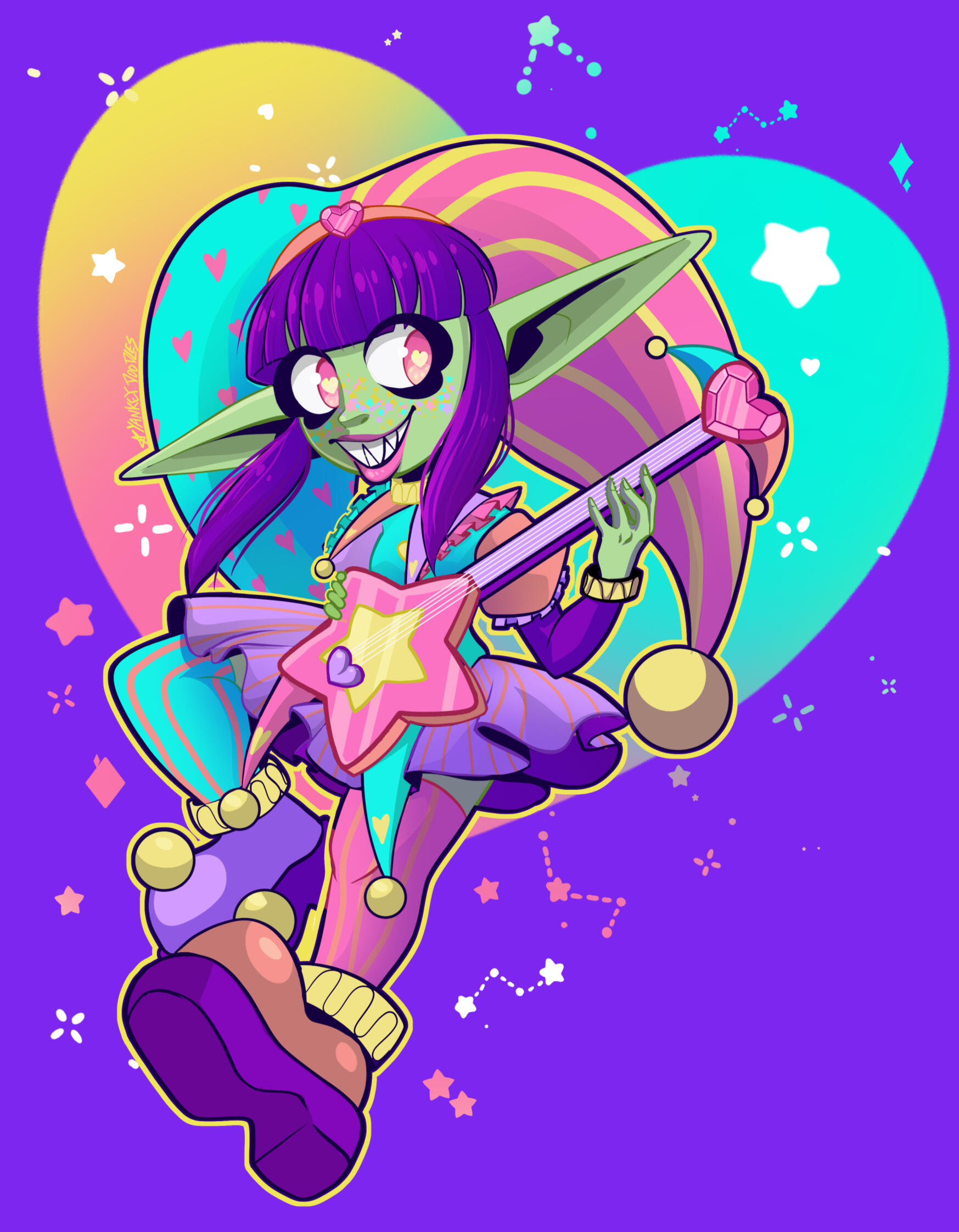 Tiyra is my bard character for a magical girl campaign I am currently in. She is a gyaru school girl by day and when she fights crime, she transforms into a jester themed magical girl. She plays guitar and loves fashion. She is a loving little gremlin goblin because she was bullied as a girl and makes it her goal to make everyone feel loved and cherished because of this. Aggressive cuteness is her in a nutshell.