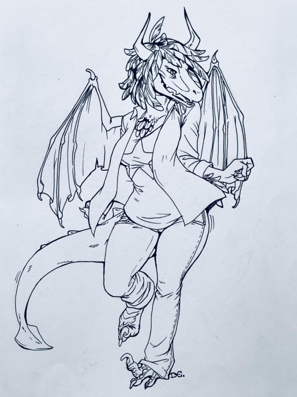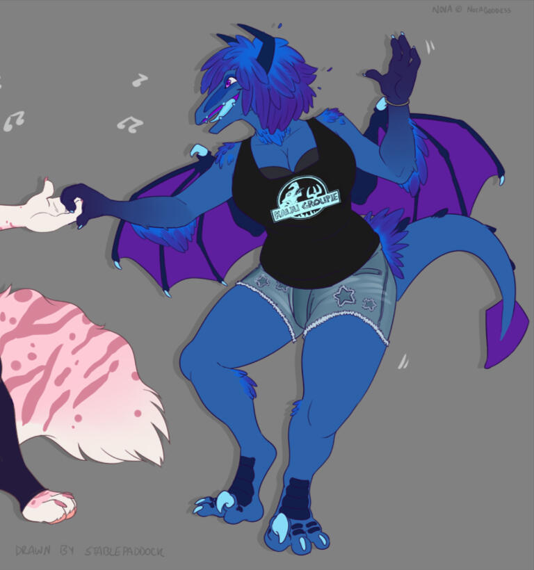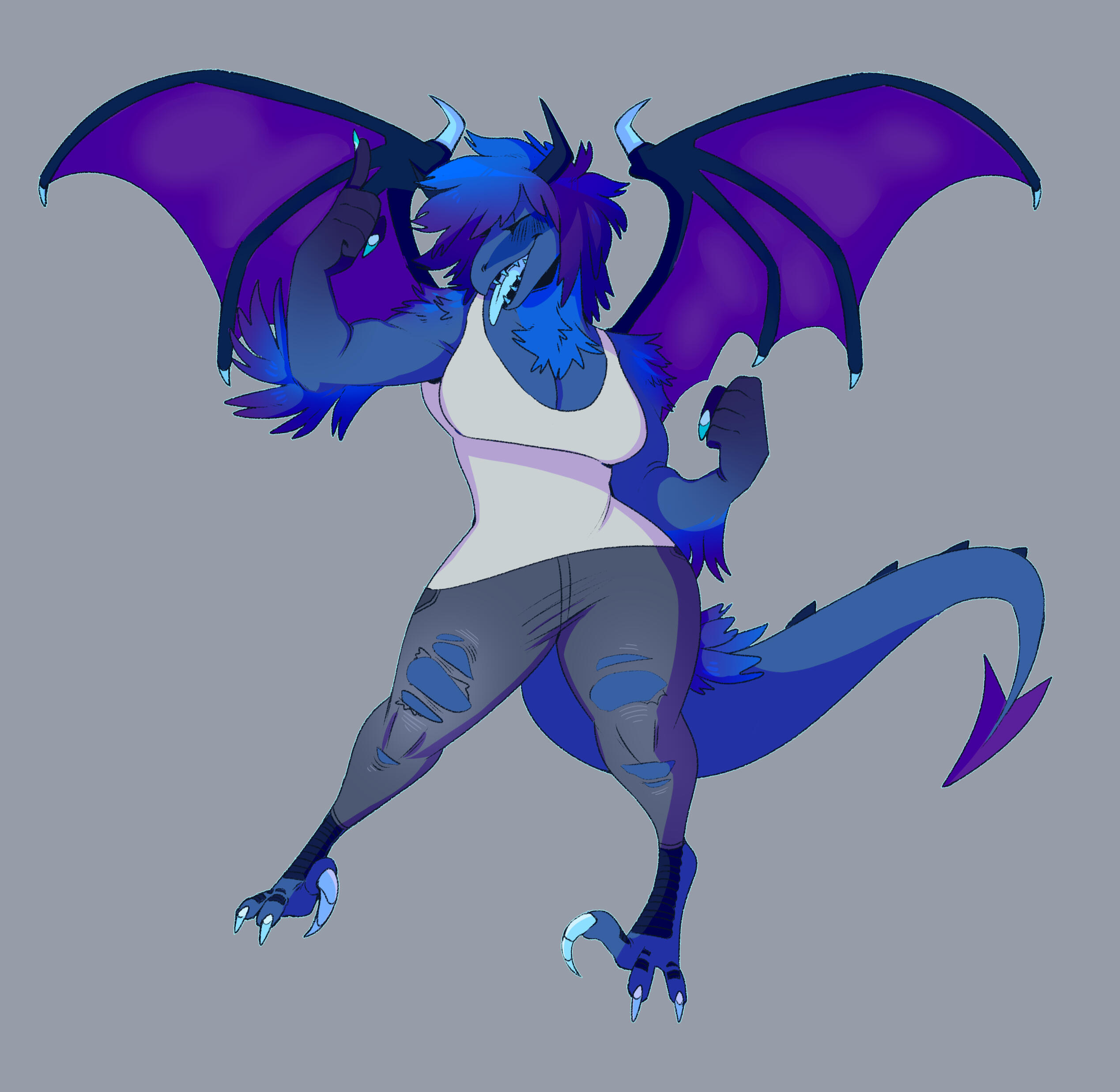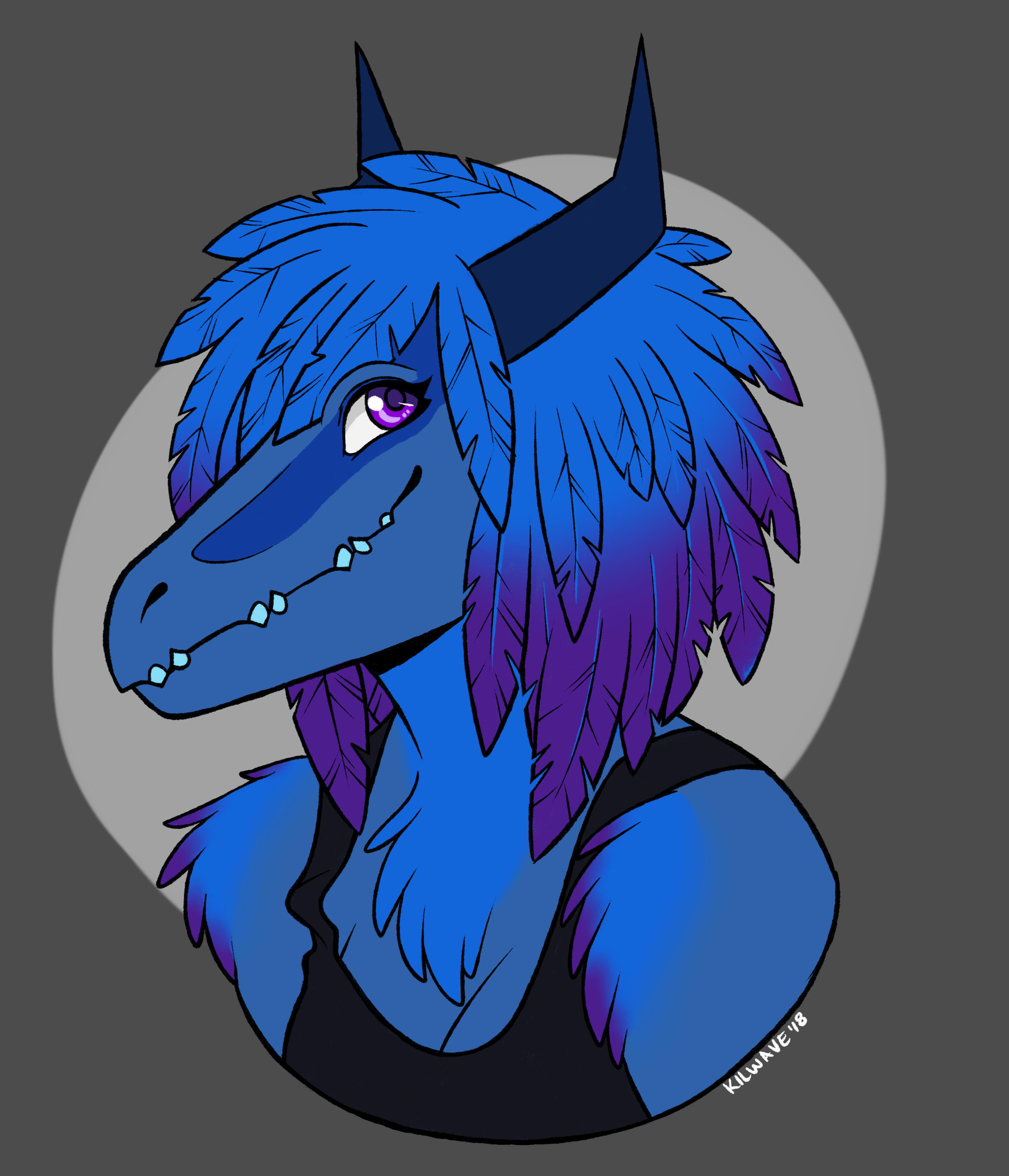 This is my fursona. She is part dragon, part raptor because I love both. Her hair is feathers styled into an A-Line bob cut. She loves Jurassic Park and likes to dance and stick her tongue out a lot because she's cheeky and coi.